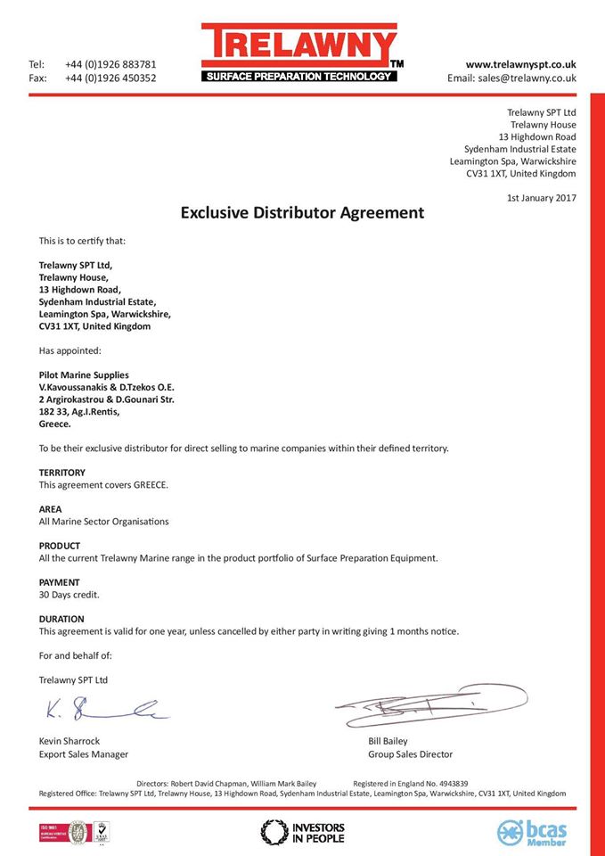 HAPPY TO ANNOUNCE THE RENEWAL OF THE EXCLUSIVITY DISTRIBUTOR AGREEMENT WITH TRELAWNY SPT LTD. PILOT MARINE SUPPLIES AND TRELAWNY GREECE CONTINUE THEIR AGREEMENT IN ALL TRELAMNY MARINE PRODUCTS OF SURFACE PREPARATION EQUIPMENT.